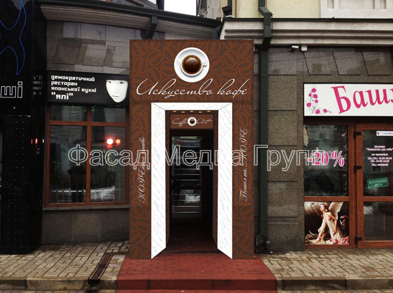 Воздействие на максимальное количество людей является несомненным достоинством входных групп. Устанавливая входные группы на фасад здания, можно массово воздействовать на целевую аудиторию, повышая тем самым эффективность рекламы.