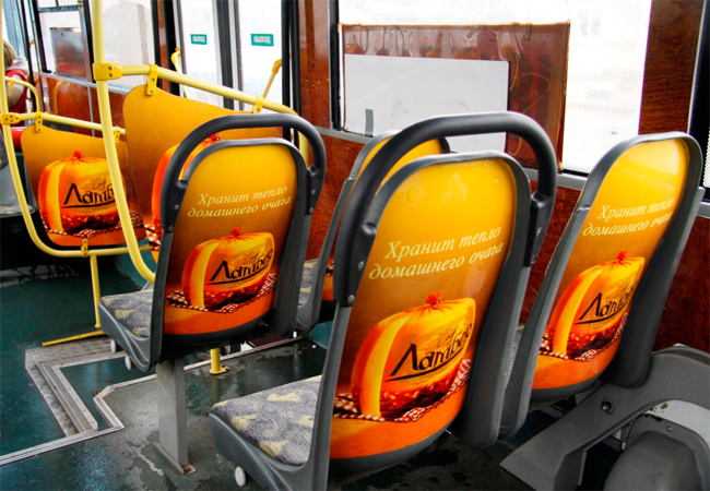 Реклама на подголовниках в трамвае на фото выше