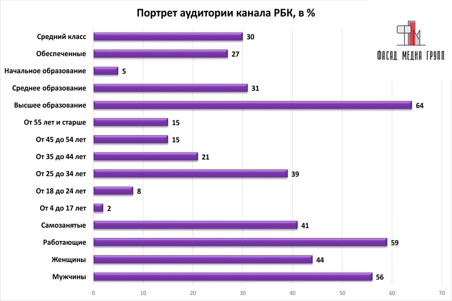 Профиль аудитории «РБК»: к аудитории «РБК» относятся: руководители высшего и среднего звена, сотрудники банков, инвестиционных компаний, фондов, бирж, аудиторских и консалтинговых компаний, журналисты, представители федеральных и региональных государственных структур, и органов, российские предприниматели и иностранные топ-менеджеры, специалисты и бизнесмены.