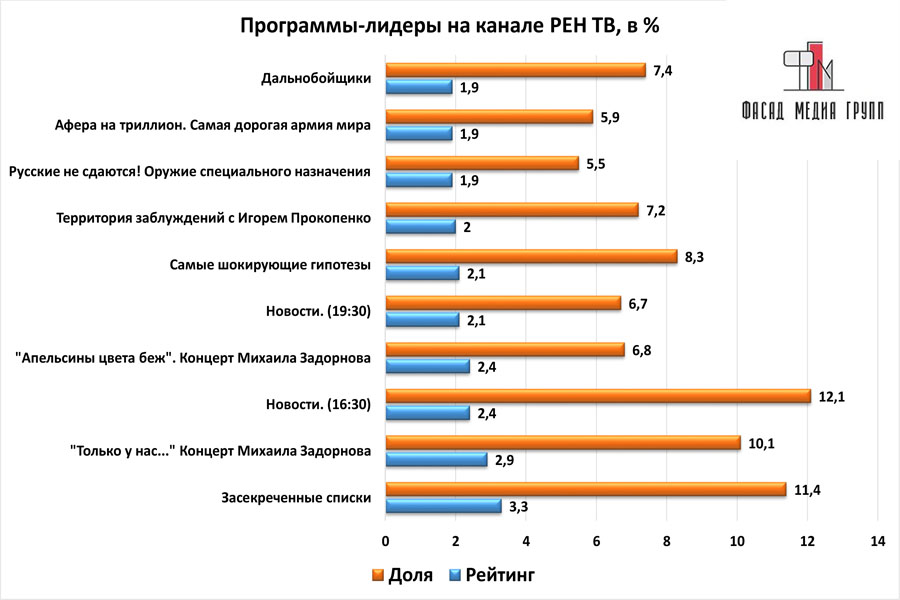 Популярность телеэфира на «РЕН ТВ» приводит к ежегодному увеличению спроса на рекламное время. Для привлечения клиентов из разных регионов России, увеличения процента продаж, повышения имиджа компании и узнаваемости бренда – размещайте рекламу на «РЕН ТВ». «РЕН ТВ» – это проверенный и востребованный канал для размещения рекламы на старооскольском ТВ. Для размещения рекламы на телевидении обращайтесь в рекламное агентство «Фасад Медиа Групп». Будем рады сотрудничеству.