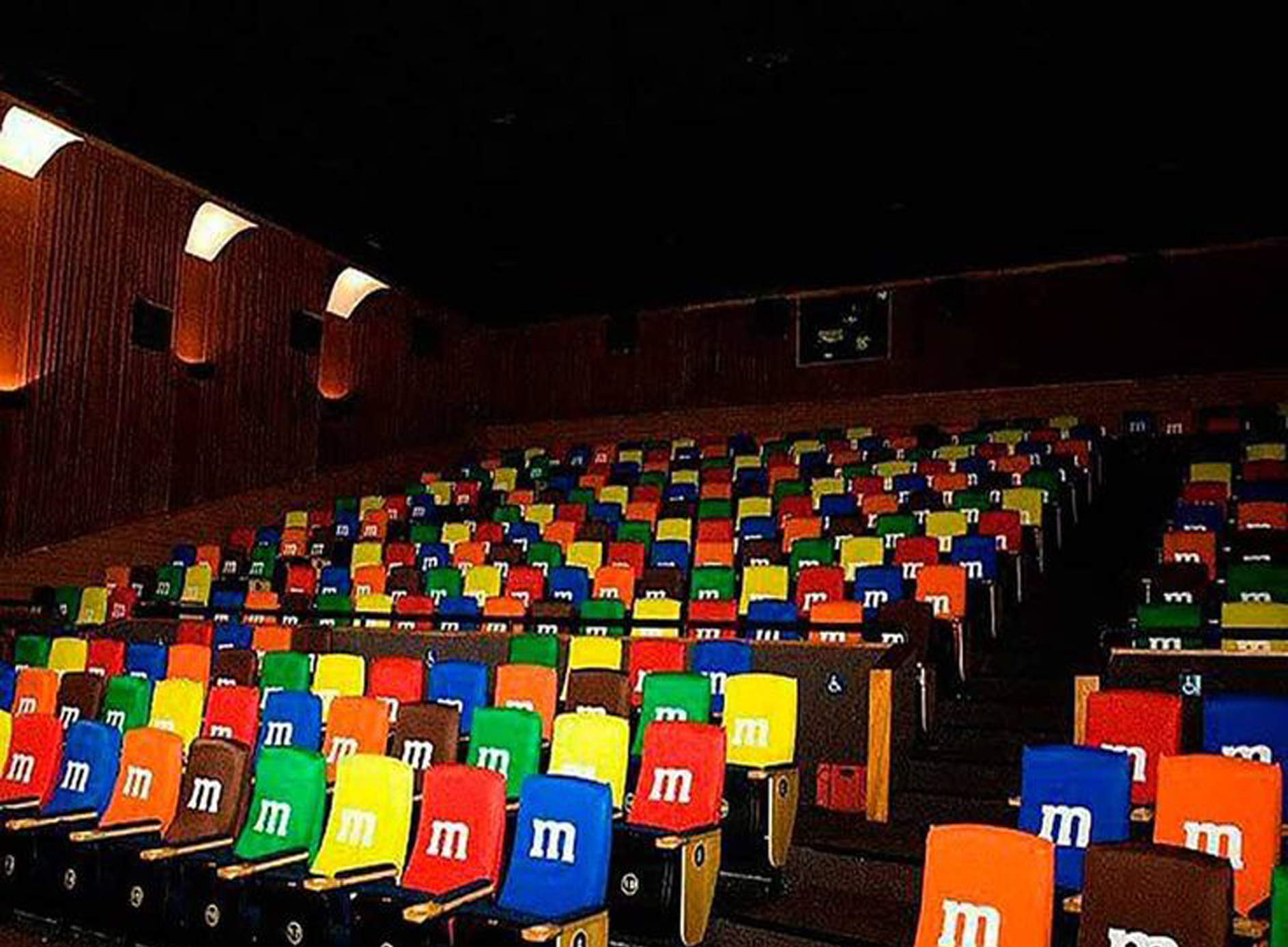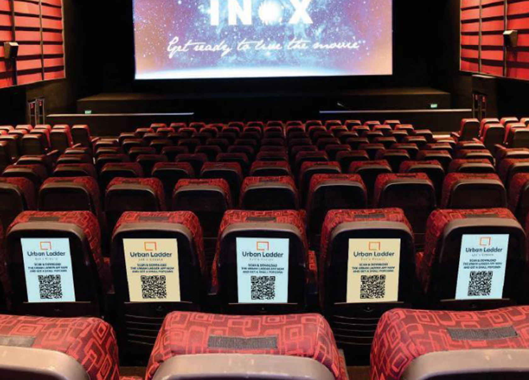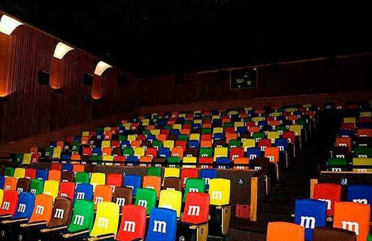 Пример рекламы в виде стикеров на спинках кресел в кинотеатрах: