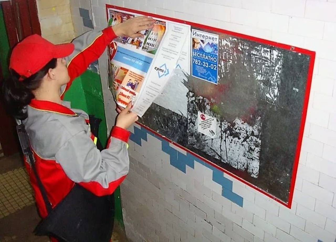 Монтаж рекламы в подъездах осуществляется по-разному в зависимости от того, какой рекламный материал размещается.